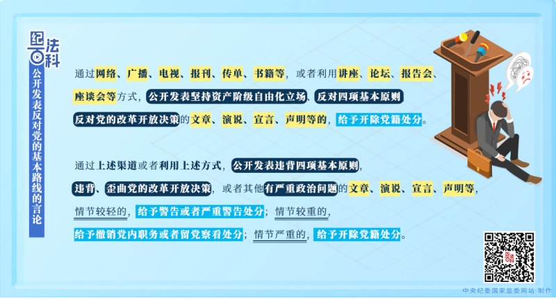 《中國共產(chǎn)黨紀(jì)律處分條例》第五十條第一款規(guī)定,通過網(wǎng)絡(luò)、廣播、電視、報刊、傳單、書籍等,或者利用講座、論壇、報告會、座談會等方式,公開發(fā)表堅持資產(chǎn)階級自由化立場、反對四項基本原則,反對黨的改革開放決策的文章、演說、宣言、聲明等的,給予開除黨籍處分。第五十一條第一款第一項規(guī)定,通過上述渠道或者利用上述方式,公開發(fā)表違背四項基本原則,違背、歪曲黨的改革開放決策,或者其他有嚴(yán)重政治問題的文章、演說、宣言、聲明等,視情節(jié)輕重給予警告直至開除黨籍處分。