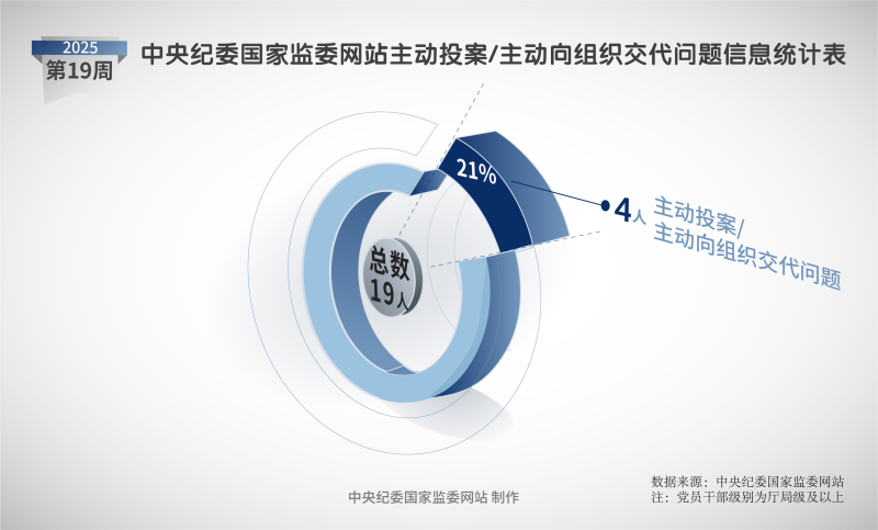 2025年第19周,中央紀委國家監(jiān)委網(wǎng)站發(fā)布的審查調(diào)查信息中,3名黨員領(lǐng)導干部主動投案,1名黨員干部主動向組織交代問題。